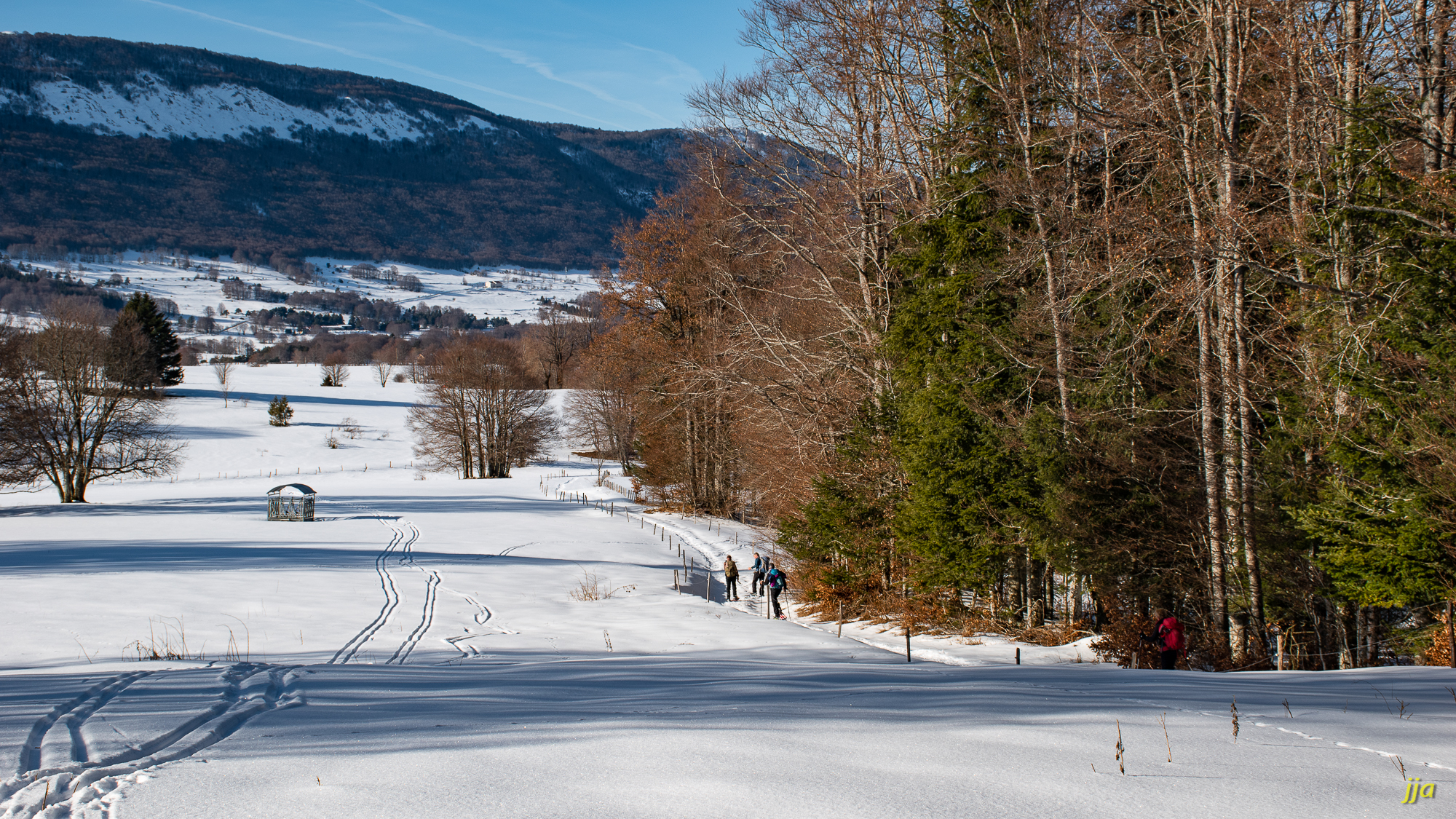Le retour se fait par le même chemin jusqu'à la cote 1409 où nous retrouvons le circuit des courses de traîneaux que nous prenons cette fois sur notre droite. Le parcours est pratiquement plat jusqu'à la cote 1374 où nous retrouvons à gauche un circuit qui redescend dans la Combe de Nève où nous retrouvons le GR93.